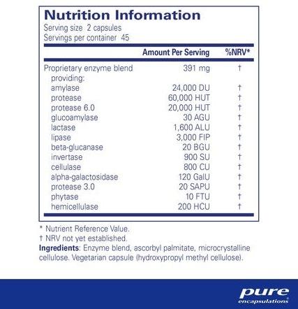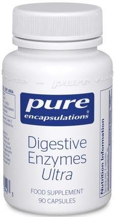Digestive Enzymes Ultra contains a high-strength, broad-spectrum mixture of vegetarian digestive enzymes. This comprehensive formula provides enzymes that are involved in the digestion of protein, carbohydrate, fat, fiber and lactose.