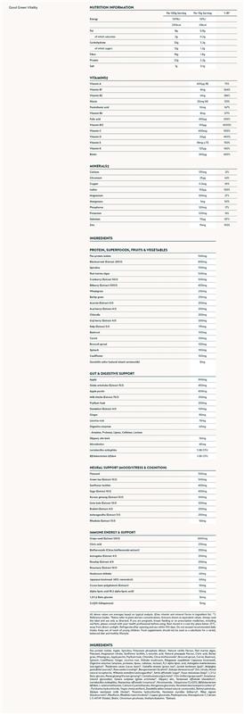 Fill in the (nutrient) blanks with Good Green Vitality. This nutritional superblend is carefully formulated to address all aspects of health. The synergistic effect of over 75 ingredients supports all of your body systems from digestion and immunity, to healthy ageing, stress management, energy, and cognition with one daily serve. Bottoms up.